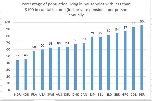 아래 그래프는 밀라노빅의 계정에서 따온건데, 자산 소득이 100불 미만인 가구의 비율이다. 보다시피 한국이 노르웨이 다음으로 가장 낮다. 다른 말로 한국은 적은 액수라도 자산 소득이 있는 가구의 비율이 가장 높은 선진국이다. 맨 오른쪽의 페루나 콜롬비아는 경제 발전 수준이 낮아서 그럴 수 있지만, 영국, 네델란드, 벨기에도 자산 소득 100불 미만이 80%에 달한다. 프랑스, 미국, 스웨덴은 60% 수준이다. 한국은 46%다.