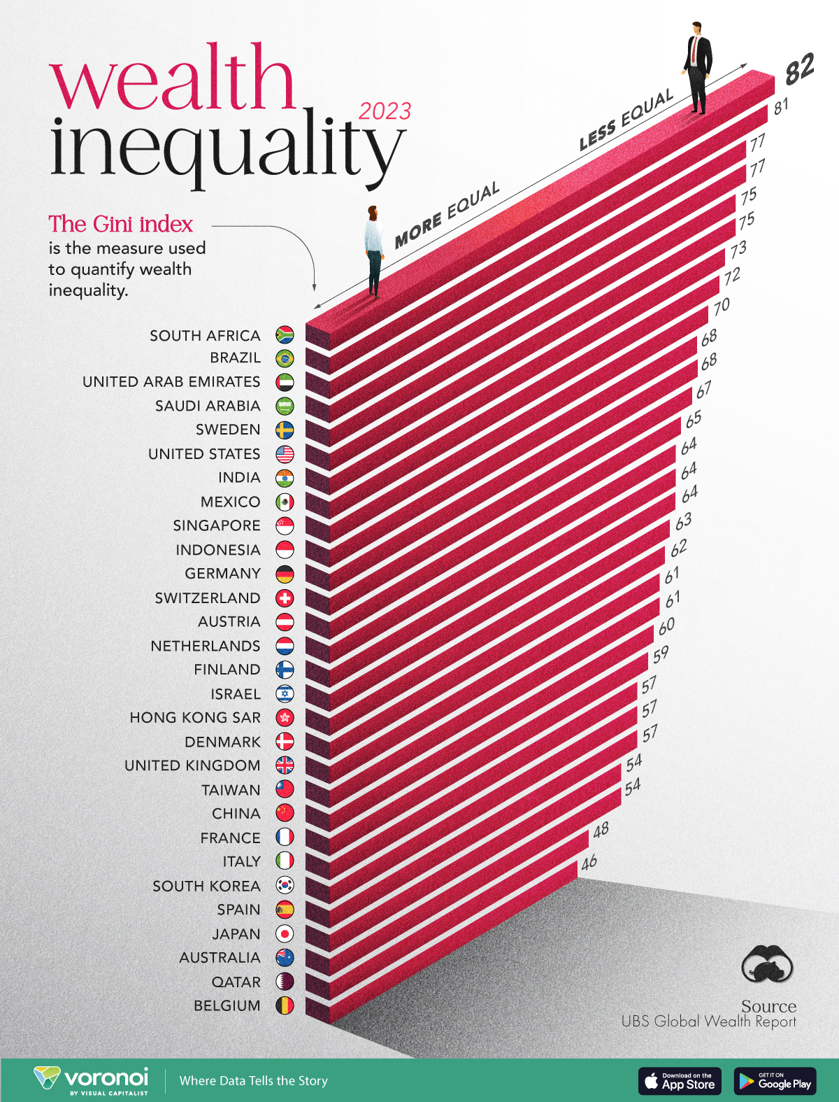 마지막 자료로 그래서 한국의 자산 불평등 정도가 어느 정도 수준인가다. UBS Global Wealth Report라는 자료를 시각화한거다 (소스는 요기). 보다시피 비록 가장 낮은건 아니지만, 선진국 중에서 상당히 낮은 편이다.