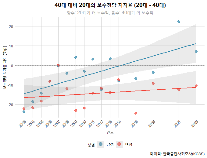 아래 그래프는 20대 남여의 40대 같은 성별 대비 보수정당 지지율의 연도별 격차 변화를 보여준다. 정당 지지율을 범보수 대 범진보로 나누었고, 범보수 지지율만 본거다. 보다시피 20대 남성의 40대 남성대비 보수화 경향이 뚜렷하다. 이 경향은 최근에 시작된게 아니고, 2003-2013 사이에 꾸준히 관찰된다. 조국 사태, 문재인 정권에 대한 실망, 2015년 이후 페미니즘의 부상으로 설명되지 않는 경향이다. 2014-2018사이에 반대되는 경향이 있었지만, 2021년 이후 전반적 보수정당 지지 경향이 확연히 나타난다.