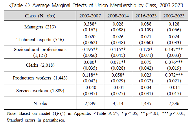 마지막으로 노조원이면 진보정당을 더 지지하는지를 파악하기 위해서 임노동자만 대상으로 분석을 했을 때, 21세기 초에는 생산직 노동자, 전문가, 매니저, 사무원에서 노조 효과가 유의했는데, 2016-23에는 사회문화전문가에서만 유의하고 생산직 노동자의 노조효과는 없다. 현재 노조효과는 전문직에서만 나타나는 현상이 되었다.