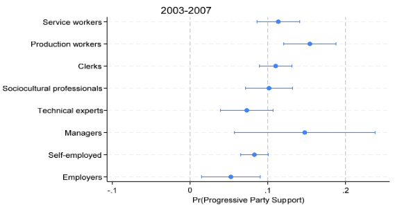 첫 번째 질문의 답이 아래 그래프인데, 21세기 초에 생산직 노동자의 진보정당 지지도가 고용주나 다른 노동자보다 확실히 높다. 이 분석은 인구학적 변수와 가구소득, 정치 태도를 통제한 뒤에도 유의하다.