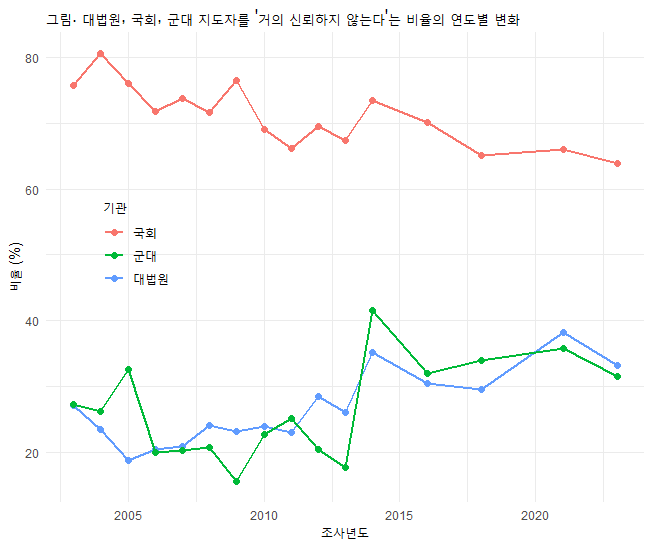 그런데 정부 관련 기관 중에서 두 곳만 신뢰도가 낮아지는 예외가 있었는데, 바로 대법원과 군대다. 아래 그래프가 2003년 이후 대법원, 군대, 국회의 지도층을 "거의 신뢰하지 않는다"고 응답한 비율이다. 2023년에도 국회에 대한 불신이 군대나 대법원보다 여전히 2배 이상 (대략 60% vs 30%) 높지만, 2003년에는 3배 (대략 75% vs 25%)였다.