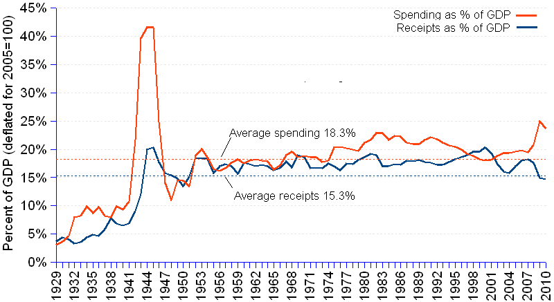 아래 그래프는 어디에서 긁어왔는지 정확히 기억나지 않는데, 연방정부의 수입과 지출이 전체 GDP에서 차지하는 비중을 보여준다. MAGA, Make American Great Again에서 얘기하는, 미국 사람이 노스탤지어를 가지는 Again이 대략 50-60년대인데, 이 때와 지금을 비교해서 연방정부가 차지하는 GDP 비중에 차이가 없다. 연방정부의 규모 축소로 갈려면 2차 대전 이전, 루즈벨트 대통령 이전으로 돌아가야 한다. 그러니까 1935년에 입법되고 그 이후 상당히 확장된, 사회보장법 이전으로 돌아가야 한다.