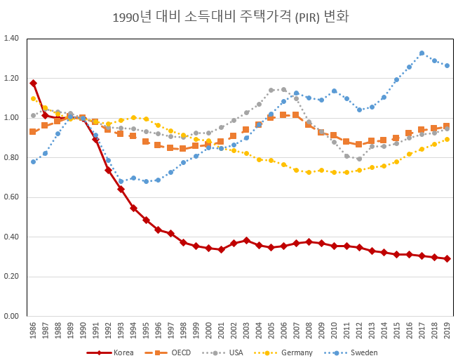 이에 반해 OECD 평균은 거의 변화가 없다. 복지국가인 스웨덴은 1990년대 이후 소득대비 주택가격이 크게 올랐다.