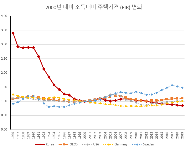 1990년대에 대규모 주택 공급으로 PIR 지수가 급락했기 때문에 위 그래프처럼 비교하는게 적절하지 않다고 주장할 수도 있다. 똑같은 그래프인데 기준점을 1990년이 아니라 2000년으로 바꿔서 상대적 변화를 보면 아래 그래프와 같다.