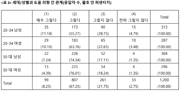 예를 들어 20-34세 남성의 주관적 계층 인식 평균은 4.911인데, 4개 집단 전체의 평균은 4.761이다. 따라서 20-34세 남성의 타인조력 의향평균은 exp(.726-.191*(4.911-4.761)/(1+exp(.726-.191*(4.911-4.761))로 계산해야 한다. 그러면 .665가 나와서 <표 3>의 수치와 일치한다.