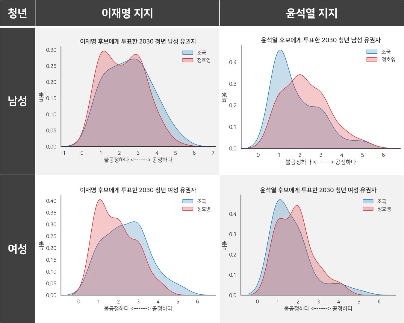 그런데 특이하게도 청년층은 성별에 따라서 응답경향이 달랐다. 이재명을 지지한 여성이나 윤석열의 지지한 남성은 전형적인 응답패턴을 보이는데, 윤석열을 지지한 여성이나 이재명을 지지한 남성은 전형에서 벗어나 있다. 정치성향에 따른 전형적 응답 패턴이 나타나지 않고, 조국과 정호영 케이스 모두 비슷하게 불공정하다고 답했다.