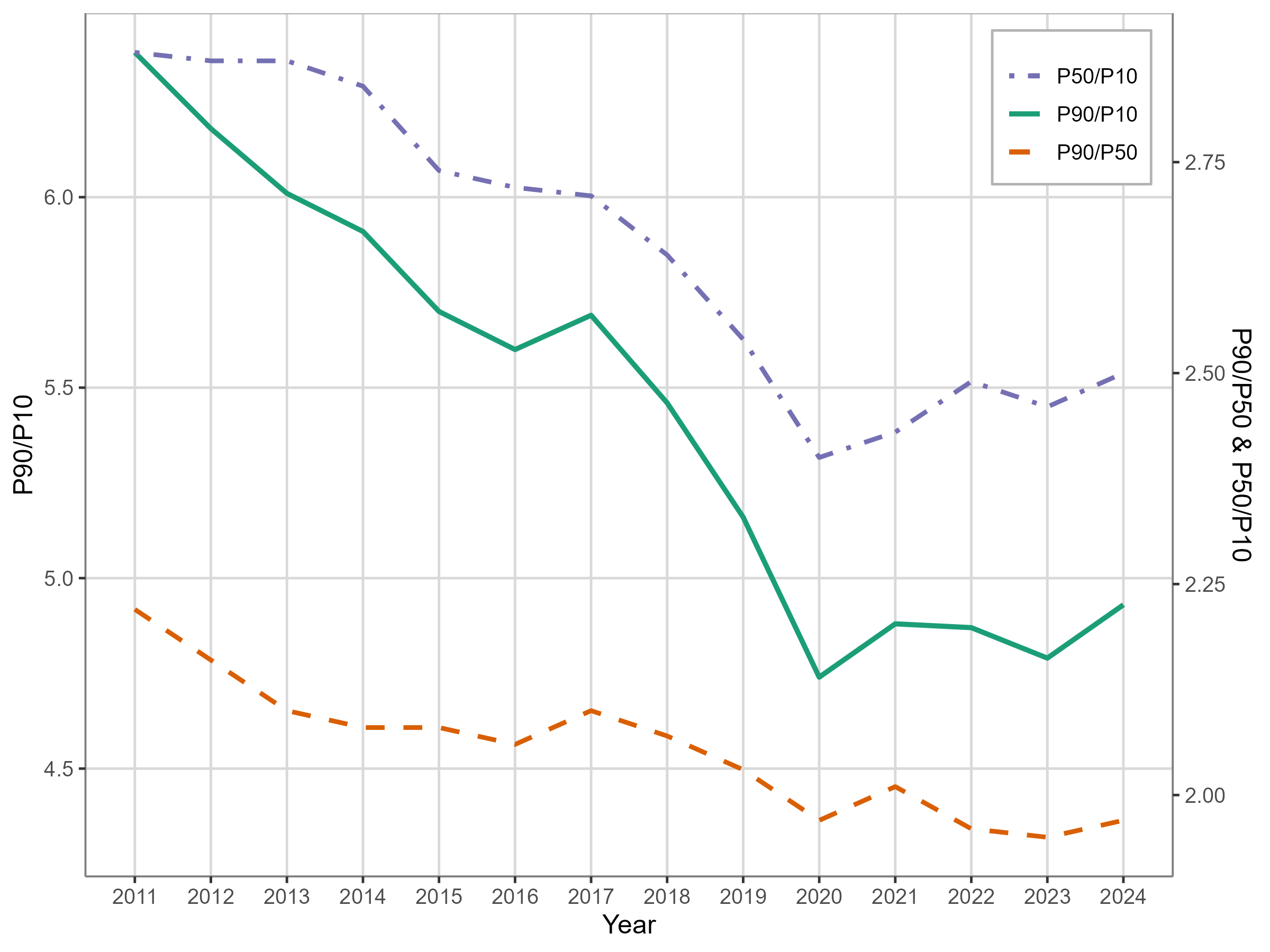 Y축을 두개로 나누는게 좋은건 아니지만, 이래야 변화를 한 눈에 파악하기에 편해서 그렇게 했다. 녹색 실선이 P90/P10이고 (왼쪽 Y축), 아래의 붉은색 점선이 상위 불평등인 P90/P50, 보라색 dash-dot 선이 하위 불평등인 P50/P10다 (오른쪽 Y축).