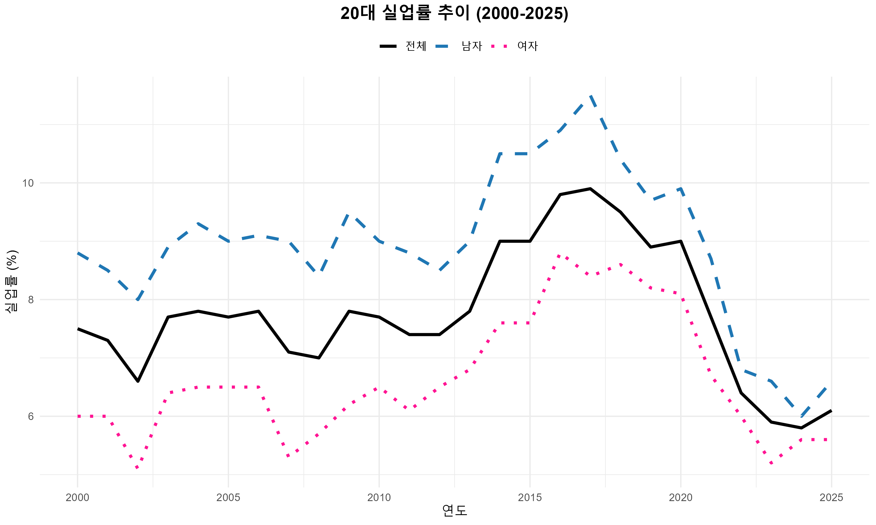 현재의 낮은 실업률은 남성에게서 더 도드라진다. 2000년 20대 남성 실업률은 8.8%였는데, 2025년에는 6.6%다. 여성은 각각 6.0%, 5.6%다.