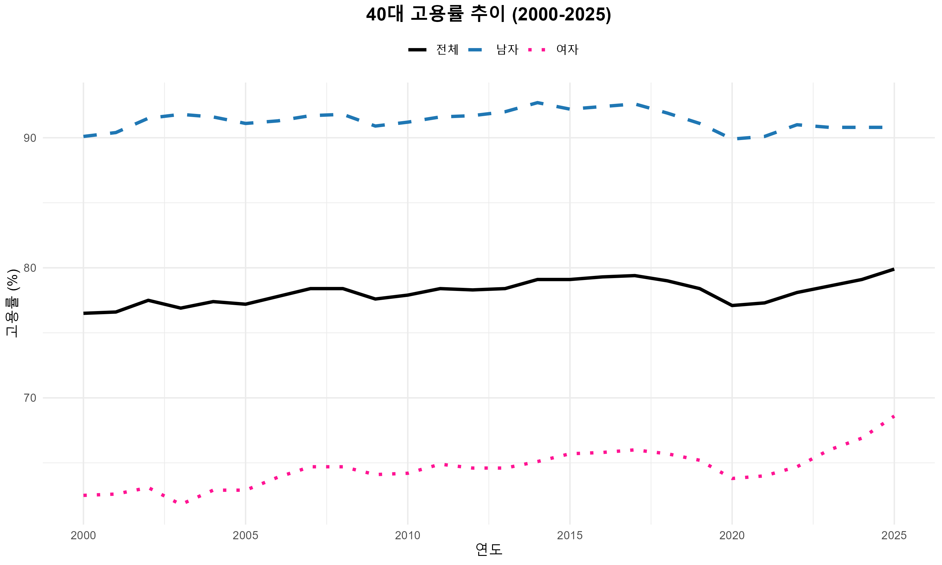 그런데 성별로 보면 남녀의 상황이 완전히 다르다. 2000년대 초반에는 남성의 고용률이 여성보다 12%포인트 높았는데, 2025년 현재는 여성고용률이 남성보다 5%포인트 높다. 이러한 성별 고용률의 역전은 2010년대 초반에 이루어져 지금까지 확대되었다. 남성은 교육의 확대가 고용률의 하락으로 이어진 반면, 여성은 교육확대로 인한 노동시장 유입의 하락 정도보다 혼인 출산의 저하와 노동시장 기회 확대의 정도가 컸기 때문일 것이다.