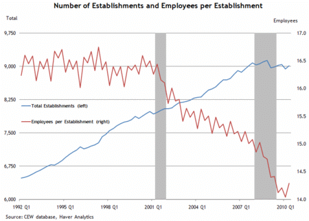 1990년대 까지만 해도 기업 작업장별 평균 노동자수가 16.5명으로 안정적이었는데, 2000년대 들어서 하락해서 지금은 14명으로 줄어듦.