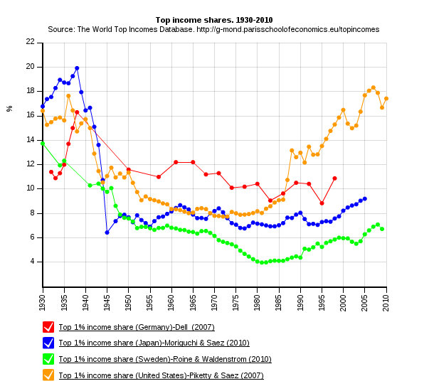 - 일반적인 상식과 달리 1980년대 초반까지 상위 1%의 소득 집중도는 미국보다 독일이 높았다. 1970년대에는 1억 총중층을 자랑하던 일본과 미국의 소득집중도에서 차이가 없을 정도.