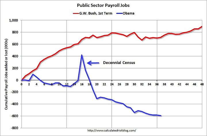 공공부문의 일자리수는 줄어들었지만, 사기업의 일자리는 오바마 정부에서 더 증가. 현재 미국의 실업률이 높은 큰 이유 중 하나가 공공부무의 일자리 감소 때문.