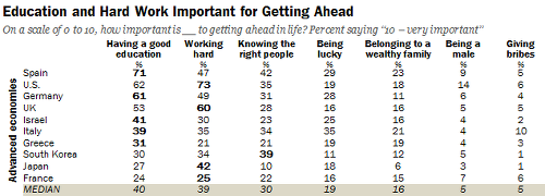 뿐만 아니라 성공이 통제할 수 없는 어떤 힘이나 행운에 의해 결정된다는 의견이 선진국 중에서 한국에서 가장 높음 (9페이지 볼 것). 74%가 그렇게 생각. 반면 미국은 40%만이 그렇게 생각함.