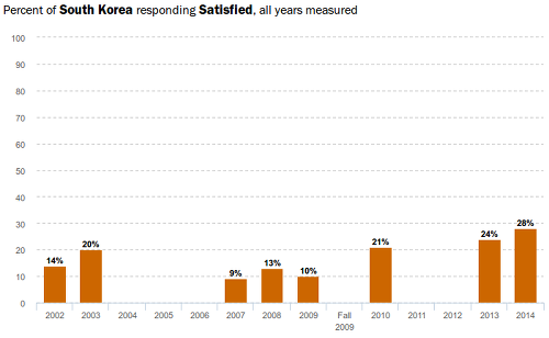 직접적인 근거는 없지만 아래 퓨 리서치의 과거 조사 결과를 보면, 그렇지 않을 가능성이 높다. 경제가 어려웠던 2007-2009년 사이에 만족도가 10% 내외이다. 현재의 만족도 28%와 상당한 격차가 있다. 한국과 타국과 마찬가지로 현상황에 대한 만족도는 경제상황을 반영하고 있다.