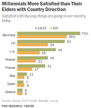 그런데 이 표에서 이태리, 스페인, 그리스는 경제가 공황 상태에 빠진 국가라 해도 과언이 아니다. 3개국의 15-24세 실업률은 이태리 42%, 그리스 57%, 스페인 55%다. 세상에 이 보다 더 나빠질 수는 없다. 한국의 젊은층의 만족률이 이 3개 국가보다 높다고 중간이라고 하기는 어렵다. 프랑스보다는 높지 않냐고 할 수 있지만 프랑스도 젊은층의 실업률은 24%에 달한다. 퐆란드는 27%.