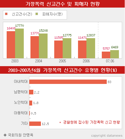 황당한 건, 이러함에도 불구하고 아래 한국 그래프를 인용한 기사는 가정폭력은 줄었는데 매맞는 남편은 늘었다는 것. 여성이 40배 더 매를 맞아도 불쌍한 건 남편들임.