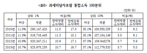 아래 표는 홍종학 의원 사이트에서 따온 것인데, 국세청 자료를 봤을 때, 2010년 이후 소득 상위 1%와 10%의 비중은 미약하나마 감소하였음. 맨 위의 그래프에서 보듯 2011년까지는 소득 사위 1%의 비중이 늘었지만, 그 이후에는 줄었음. 과세미달자 포함 상위 1%가 전체 지니계수와는 반대로 움직이는 경향이 적어도 최근 몇 년 간은 보이지 않음. 상위 1% 집중도가 줄어든 기간이 얼마되지 않아 (1)의 가능성을 완전히 배제할 수는 없지만, 그 가능성이 얼마나 클지는 의심스러움.