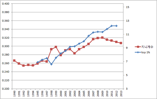 채훈아빠님 포스팅에서 따온 아래 그래프에서 보다시피 개인소득으로 탑1%의 전체 소득 비중은 증가했지만, 가구별 가처분 소득으로 본 지니계수는 2008년 이후 지속적으로 감소.