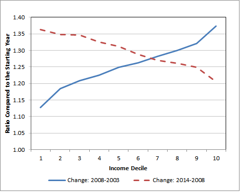 그래서 두가지를 살펴봄. 우선 소득 분위별로 2003-2008년 사이, 그리고 2008-2014년 사이 1인 가구를 포함한 전국민 가구의 소득 변화를 알아봣음 (통계청 자료). 그랬더니 아래 그래프에서 보듯 2003-2008년은 소득 상층일수록 소득 상승률이 높고, 하층일수록 낮아, 불평등이 증가했는데, 2008-2014년에는 그 경향이 바뀌어서 소득 하층의 상승률이 소득 상층의 상승률보다 높아 불평등이 전반적으로 줄어들었음.