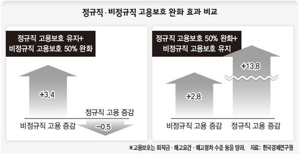 전경련 산하 한국경제연구원의 결과입니다. 비정규직의 보호 기준을 완화해도 고용창출 효과는 적고, 정규직 고용보호를 완화하고 비정규직 고용보호를 유지해야 고용창출이 된다는 거죠.