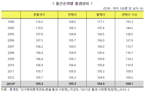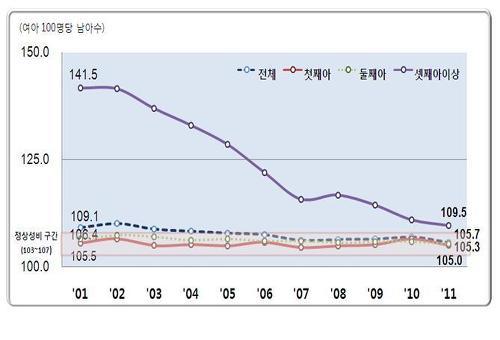 아래 그래프는 21세기의 변화다. 보다시피 셋째 아이의 성비도 2011년에 109.5로 정상에 가깝게 줄었고, 2013년에는 108로 떨어진다.
