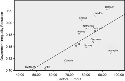 이 때문에 전체적으로 높은 투표율을 기록하는 국가에서는 노동계급, 중하층의 투표율이 높다는 의미임. <높은 투표율 = 중하층과 상층의 투표율 격차 감소>이기 때문에, 투표율이 높은 국가에서 정치인들이 중하층의 니즈에 더 잘 반응하게 됨.