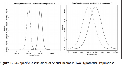 아래 그림은 가상의 사회에서 남녀의 소득 분포를 나타낸 것이다. X축이 소득이고, Y축은 비중이다. 두 사회에서 남녀 간의 불평등 정도(평균 임금 격차)는 동일하다. 다른 점은 왼쪽 사회에서 여성(점선)은 모두 남성보다 소득이 작은 반면, 오른쪽 사회에서는 평균 임금은 낮더라도 여성이 남성보다 소득이 높을 확률이 상당히 있는 사회다.